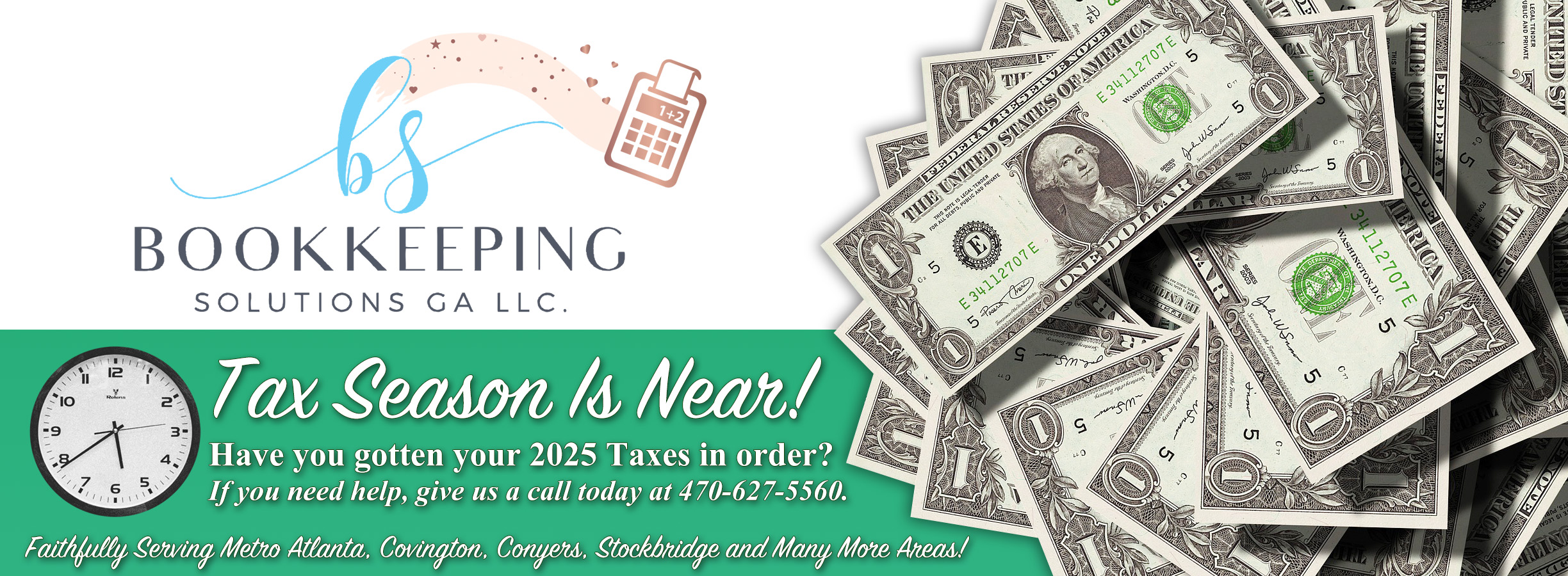 Bookkeeping Solutions is an accounting firm, located in Covington, GA that focuses on accounting, tax preparation, and bookkeeping for individuals or small to medium sized businesses across metro Atlanta and Georgia. We make it easy for you to achieve financial health by helping you with all aspects of your finances—from bookkeeping to accounting, from tax preparation to financial reports. If you live in the Covington, McDonough, Conyers, or Stockbridge, Georgia area, please call us today at 470-627-5560 and we will be glad to help you.